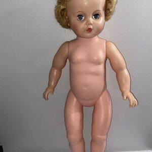 This vintage Ellanee 26-11 Drink N’ Wet Toddler doll from 1960 is a charming 28-inch play doll with curly blonde hair and blue eyes that open and close. Made of non-toxic vinyl and hard plastic, this Caucasian girl doll by Ideal is a timeless treasure for collectors and doll enthusiasts. The doll comes without packaging and includes removable clothes, suitable for all occasions, making it a durable and water-resistant companion for imaginative play.
