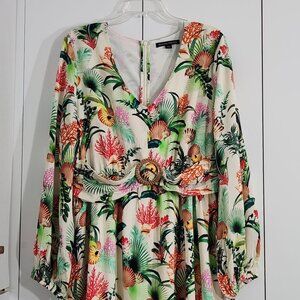 Approx. Measurements: 22 in pit to pit/36 in waist/25 in sleeve/58 in length