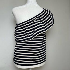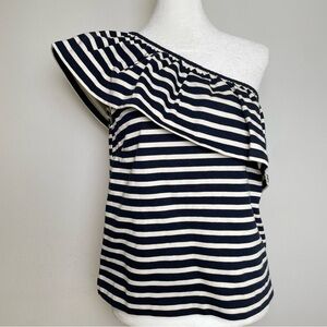 J. CREW Nautical Stripe One Shoulder Bold Ruffle Navy White Cotton Top Blouse XS