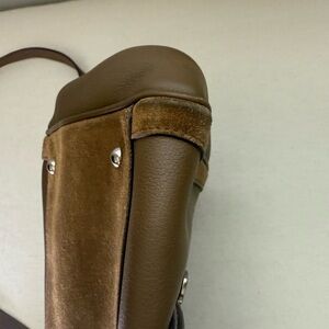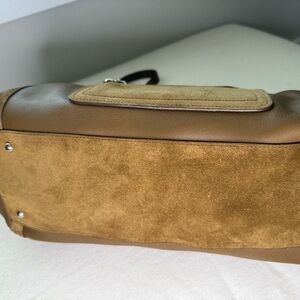 Chic and versatile travel bag. Rich brown leather with suede accents. Ideal for stylish journeys. made from a combination of leather and suede. The dimensions of the bag are 17cm in height, 32cm in width, and 15cm in depth, making it a practical choice for daily use. This bag is an excellent use condition. The only callout is in scratching around the clasp on the top of the bag. See pictures.