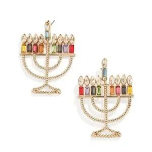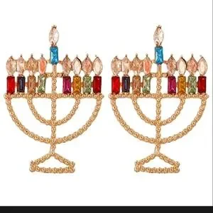 Elegant menorah earrings with vibrant multicolor rhinestones. Perfect for Hanukkah.