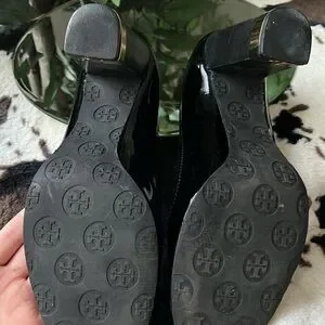 Chic Tory Burch heels in sleek black. Features a striking gold emblem. Ideal for stylish outings. 4 inch heel. Slight scratching on the gold strip of the heel as pictured.