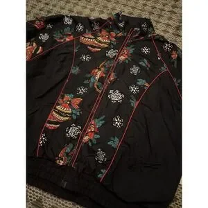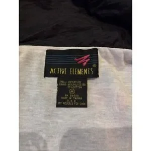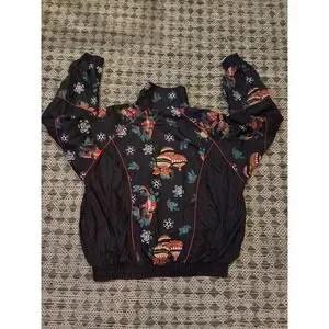 The Active Elements Vintage 80s Windbreaker Jacket is a women's winter outerwear piece perfect for the holiday season. With a nod to vintage fashion and a fun Christmas theme, this size M jacket features a black nylon outer shell and a classic windbreaker style. The jacket exudes a playful and unique charm, making it a standout addition to any winter wardrobe.