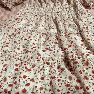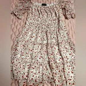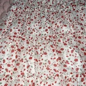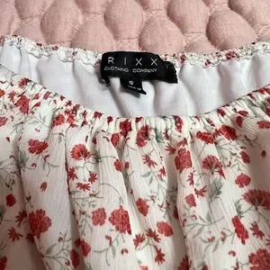 can be worn off the shoulder off white/cream color stretchy with elastic on waist and sleeves red floral pattern