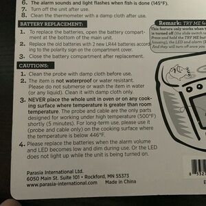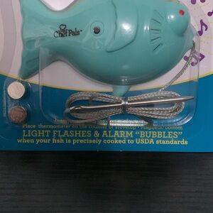 Fish Thermometer for Oven Baking Fish. The batteries on package look like they are old and will not be good to use. You will need to put batteries in it. Light on fish lights up and fish makes a sound when correct temp is reached. Unused in original packaging.
