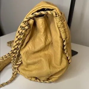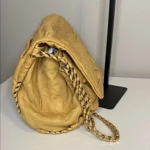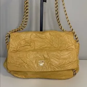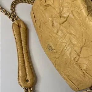 Chic MCM shoulder bag in tan leather. Features elegant chain straps. Perfect for stylish outings.