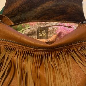 Chic tan leather bag with fringe detail. Braided accents and metal studs add style. Perfect for a bohemian touch.