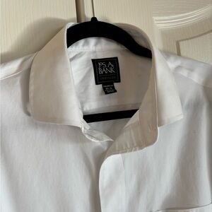 Jos A Banks Traveler white dress shirt with long sleeves and placard pocket. Classic styling. See above description.