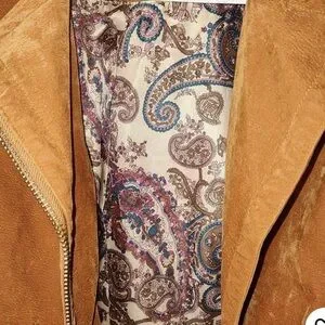 Stylish brown vegan leather moto jacket with zipper details. Perfect for layering.