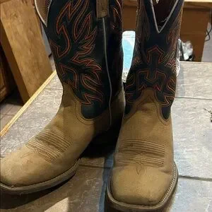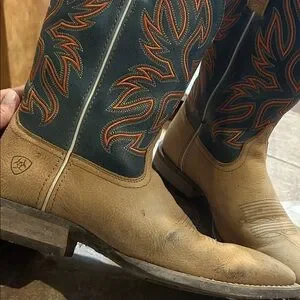 Stylish Ariat cowboy boots. Tan leather foot. Blue shaft with orange stitching. Perfect for Western wear.