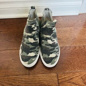 These Steve Madden sneakers feature a striking green and gray camouflage pattern, perfect for urban casual wear. The high-top design offers ankle support, while the white rubber sole ensures comfort and durability. With a traditional lace-up closure, these sneakers blend military-inspired aesthetics with modern style.