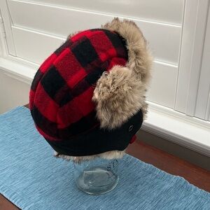 Embrace the cold season with the Goodfellow & Co Men's Plaid Faux Fur Trapper Hat. This heavy-duty trapper hat, featuring a vibrant red plaid pattern, is designed to keep you warm during outdoor winter activities, such as skiing and snowboarding. The one-size-fits-all build ensures a comfortable fit, while the fold-up earflaps and adjustable buckle chinstrap offer additional customization for a snug experience. Crafted from a blend of acrylic, polyester, and faux fur, this hat is both durable and soft to the touch. The faux fur accents add a touch of style, making it a perfect accessory for both casual wear and activewear. Whether you're hitting the slopes or just enjoying a chilly day outdoors, this trapper hat is a must-have for fall and winter. Excellent condition.