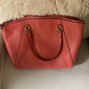 Coach tote in Coral leather and silver hardware. Bag has remove able crossbody. Features a roomy interior and elegant design. Zip closure with front zip pocket. Interior has one zip pocket. Perfect tote that is sure to bring lots of compliments! Beautiful color and quality that Coach does so well!