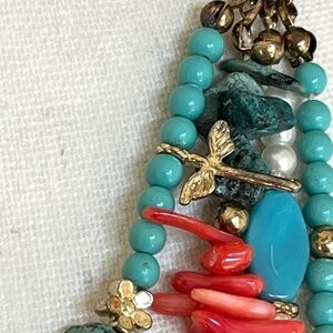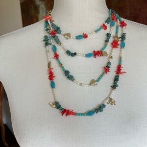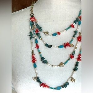 Coral and Turquoise Faux Pearl Beads Necklace 4 layers of gold animal charms