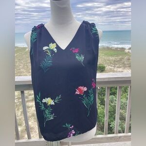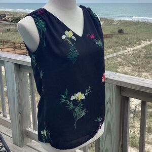 A breezy and beautiful Vince Camuto sleeveless top featuring a vibrant floral print on a lightweight black fabric. Designed with a flattering V-neckline, delicate shoulder gathers, and a button keyhole back. Perfect for layering or wearing solo on warm days.