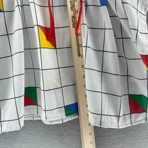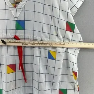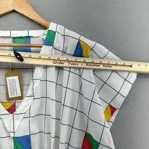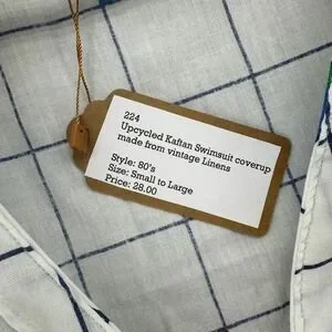 Upcycled handmade by a local artist in Austin, Texas. Kaftan swim coverup in 80s/90s grid print. This unique piece offers a relaxed fit and a striking visual narrative with its pop art-inspired graphics. Made from vintage linens.
