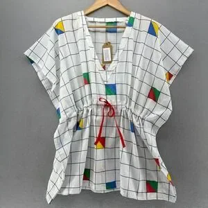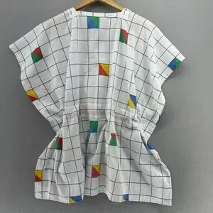 VTG Upcycled Kaftan Swimsuit Coverup 80s Style Geometric Print White SZ S-XL 90s