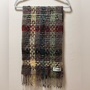 Suantrai of Ireland 100% wool versatile cozy winter neck scarf, country chic vibe. Earthy green, brown and cream colors. Unique fringed lightweight Irish knitwear.