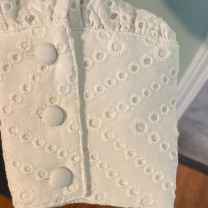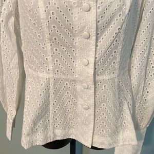 NWT WOMEN’S WHO WHAT WEAR SCOOP NECK EYELET SHIRT, PEPLUM STYLE BOTTOM HALF, BUTTON CLOSURE, 100% COTTON & COTTON LINING-EXCELLENT CONDITION-SIZE-M