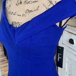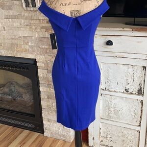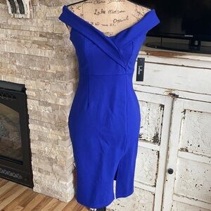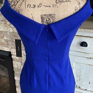 Lulu’s Classic Glam blue off-the-shoulder zip back leg slit body con dress
