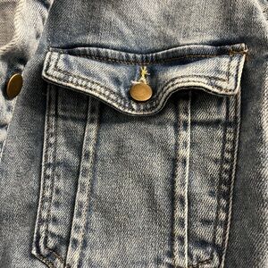 Stylish cropped denim jacket. Features frayed hem and buttoned pockets. Ideal for casual wear. Purposefully distressed. See pictures.