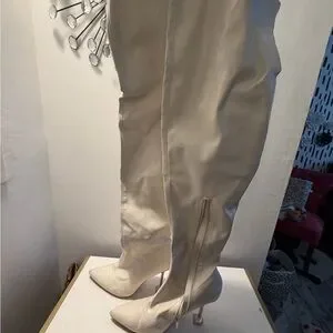 Step out in style with these elegant cream boots. These boots go thigh high and are wide leg friendly. About a 3 in heel, worn once, (need to be cleaned, I will clean upon purchase)