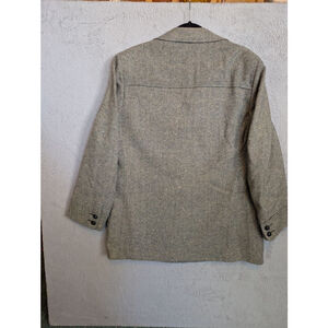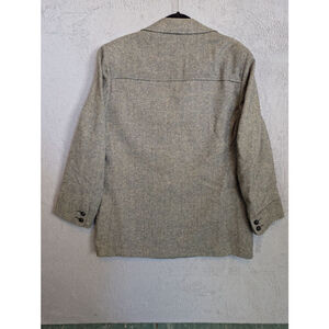 This pre-owned Men's Pendleton jacket is made from 100% virgin wool, featuring a beige and brown herringbone pattern. It features a classic collar, four-button front, and two flap pockets with buttons. The long sleeves are finished with two decorative buttons on each cuff. It has a dark interior lining. Visible measurements indicate a length of approximately 31-32 inches and a chest width of about 24 inches laid flat. in excellent condition considering it is vintage