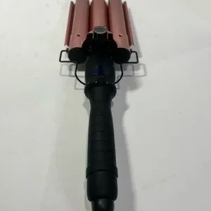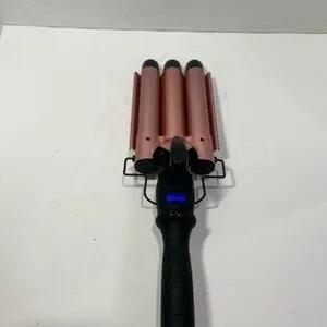 Pink curling iron with a sleek black handle. Perfect for styling waves. Alure Three Barrel Curling Iron Wand Hair Waver with LCD Temperature Display - 1 Inch Ceramic Tourmaline Triple Barrels, Dual Voltage Crimp