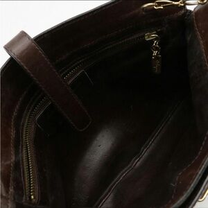 Luxurious dark brown leather bag. Features elegant craftsmanship.