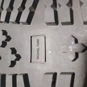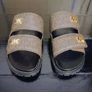 NEW Michael Kors Brown And Black Stark Slide Sandals with Gold MK Logo Accents