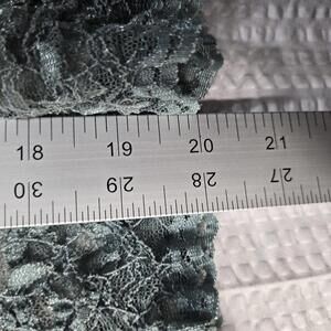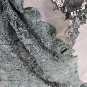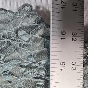 Beautiful Merona lace top in a blue-green shade, size Medium. Features sheer floral lace, cap sleeves, embroidered neckline with ribbon detail, and a soft polyester lining. Feminine, romantic, and perfect for layering or dressing up.