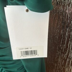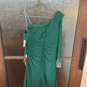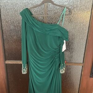 Absolutely exquisite dress by designer MacDuggal. If you know the brand, you know discounts are hard to find. This one is drastically reduced. It is beautifully made and a glorious color for the holidays. My issue is simply I am only 5' 2" and this dress really belongs on a long-legged beauty. The size 10 is true to size and the dress is in perfect NWT condition. The ruching hides any tummy issues and the back small train is perfect for a mother of the bride or groom this holiday. I will not delay in getting this gorgeous gown mailed to you in a timely matter for your holiday wear.
