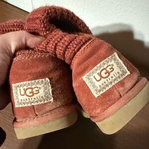 Nice preowned condition UGG cardy knot boots, rusty red color with brown buttons. Size 9.