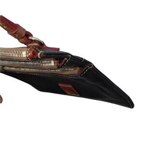From Dooney & Bourke is this ultra vogue black genuine leather cross body bag, purse, shoulder bag, trimmed in pecan brown genuine leather! It features a front logo tab and on the front, 2 outside zipper pockets! Top zipper closure, and inside there is one main compartment with red lining! Absolutely the cutest bag! Contrast stitched, measures: 8.5 " x 8.25" x .75", and the strap is 50" at adjustable max with a 24.5" drop! Excellent! Superb EUC Condition! ***ABSOLUTELY GUARANTEED CONDITION: EUC MINTY-EXCELLENT TO LIKE NEW, by Lily @HauteClub!*. Offers welcomed!***!