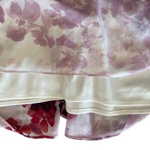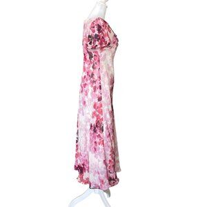 This SLNY pink floral chiffon midi dress is a beautifully feminine piece perfect for spring events, weddings, garden parties, or daytime celebrations. It features a soft draped cowl neckline, sheer flutter sleeves, and a flowing chiffon overlay that creates movement and dimension. The watercolor-style floral print shifts from soft blush to deeper berry tones, giving it a romantic, airy feel. Fully lined for comfort and coverage.