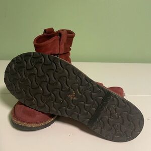 Suede burgundy/wine red booties. Really comfortable cork Birkenstock footbed. Fits 9/9.5 with wide toe box. Sole and uppers are in great condition.