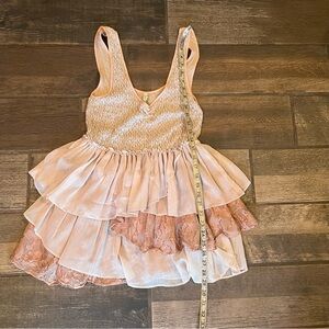 This is a pretty tunic top by Free People. The bodice is a stretchy textured fabric. From the waist down are layers of ruffles and lace. So absolutely cute. This top is in Excellent Condition. Size Medium. Please see photos for more details and measurements.