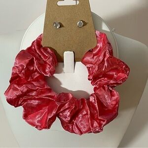 Handmade Pink Stud Earrings and Satin Pink Scrunchie Set, Hypoallergenic…