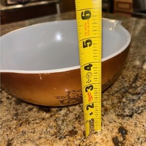 Charming Pyrex bowl with a brown harvest pattern. Ideal for mixing and serving.