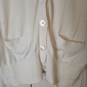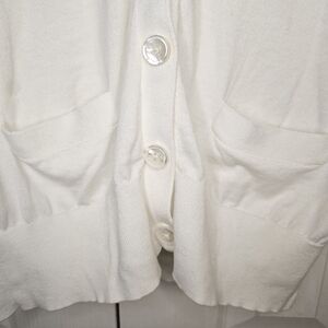 Classic white women's stretch cotton cardigan sweater with very pretty pearly big buttons.