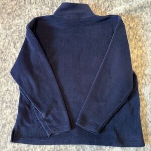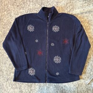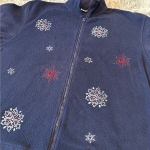 Cozy navy fleece jacket featuring snowflake embroidery in red and white.