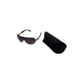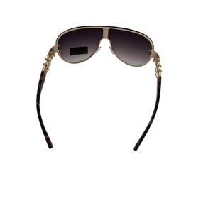 Elevate your style with these chic Guess women's shield sunglasses! The rose gold-toned metal frame exudes sophistication, while the bordeaux or pink gradient lenses provide 100% UV protection, ensuring both fashion and function. The temples are beautifully accented with intricate gold-colored chain-link detailing, adding a touch of luxury. The earpieces feature a stylish tortoise-shell pattern, completing the look with elegance. These sunglasses come with a black faux-leather protective case featuring the iconic "GUESS" logo, perfect for keeping them safe and scratch-free. Original MSRP: $80. A must-have accessory for any fashion-forward woman!