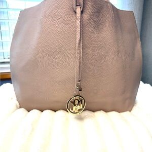 This Badgley Mischka chain tote bag in taupe vegan leather is a chic and spacious carryall for everyday use. Features include: