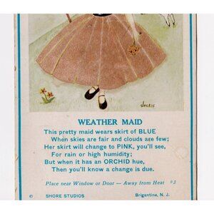 Charming vintage “Weather Maid” postcard from Atlantic City, N.J., made by Shore Studios (Brigantine, NJ). This novelty postcard features a fuzzy flocked skirt that was originally designed to change color with the humidity—blue for fair, pink for rain, and orchid for high humidity. Today, the skirt remains soft to the touch, but color change function is untested and likely inactive after all these decades.