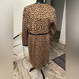 Stylish animal print trench coat. Features sleek black accents. Ideal for a standout style.