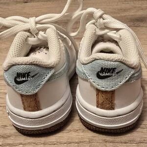 Stylish and comfortable, these Nike toddler sneakers feature a classic white design with a touch of blue. Perfect for everyday wear. Great condition. No scuffs or marks.