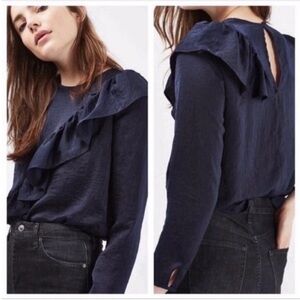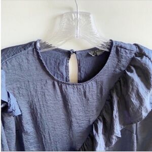 Ruffle on one shoulder and asymmetrical ruffle across the bodice