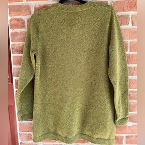 Cozy olive green cardigan. Features diamond pattern. Button-up front. Two front pockets.