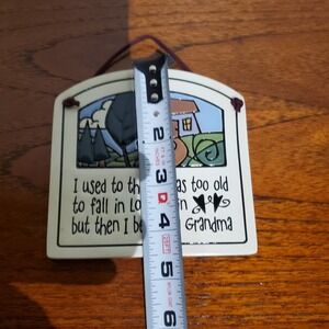 This is a handmade small clay tile from Spooner Creek, featuring an etched design by artist Michael Macone. Created in 2003 in Wisconsin, the tile has a glossy finish and is suitable for home decor. The design is titled "Became a Grandma" and is part of the Small Arch Tiles collection.
