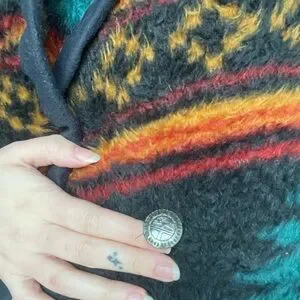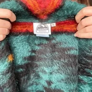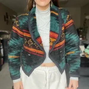 Really freakin awesome and unique warm vintage jacket that reminds me of a specific blanket from childhood. Teal / turquoise base with black, red, and mustard or orange Aztec patterns. Comes with shoulder pads that I can sew back in—would either way ship them with it as they match (just needs legit a one-hold stitch, nothing complicated). Excellent condition, EUC. Brand: Together West. Just too small for me! True to size.